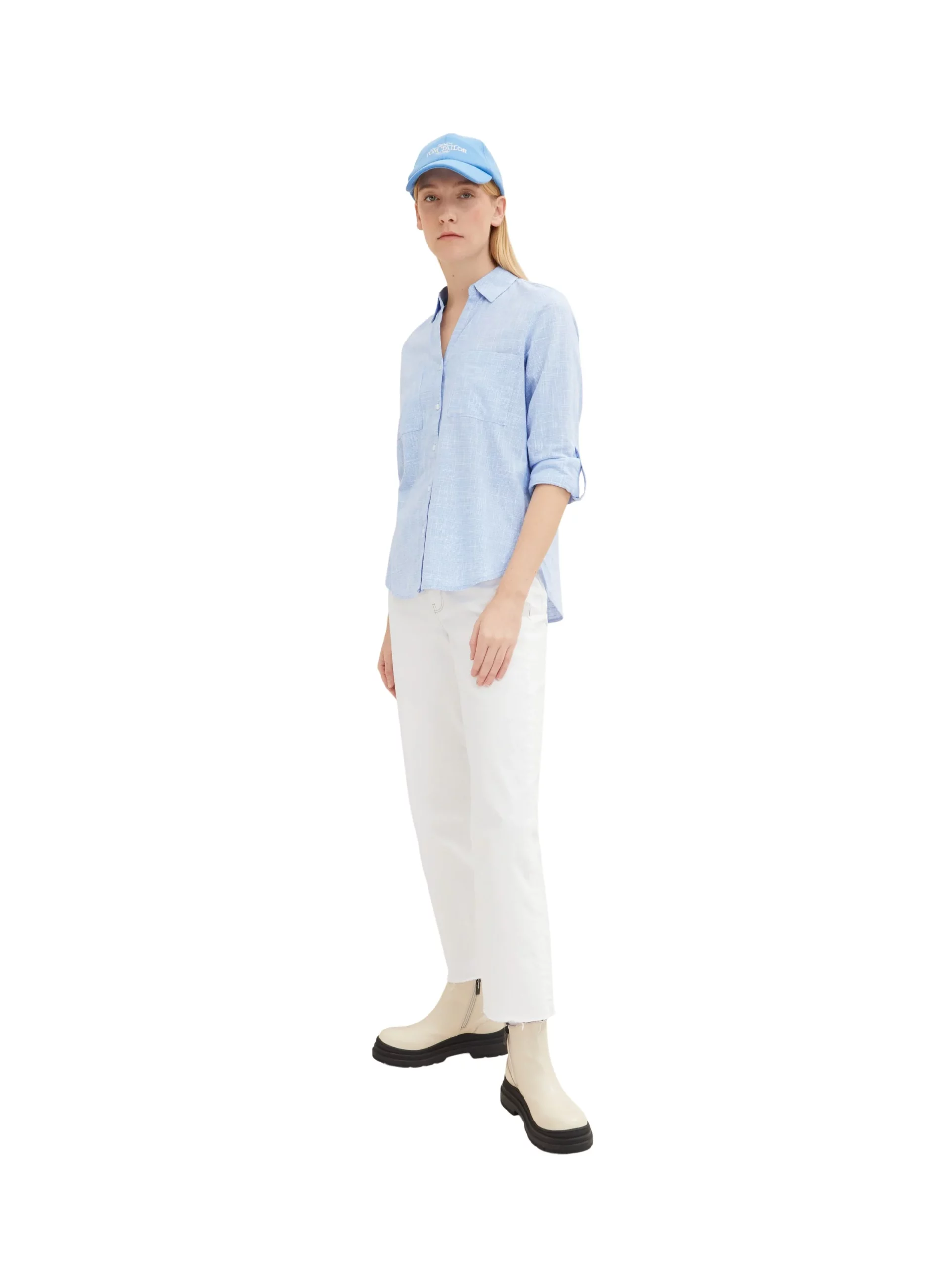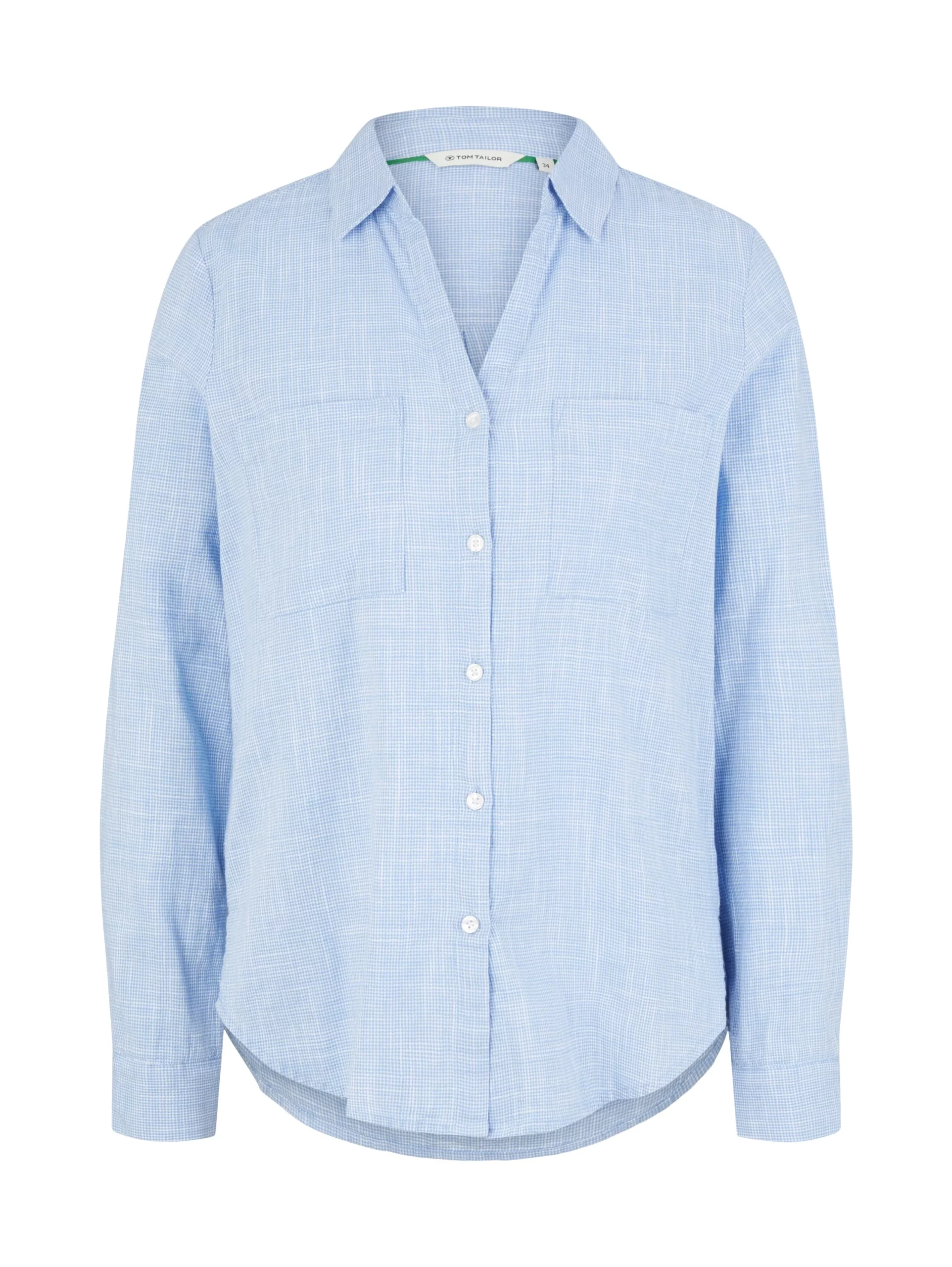 * langärmlig mit Kragen, V-Öffnung und Knopfleiste