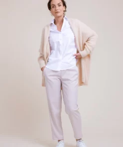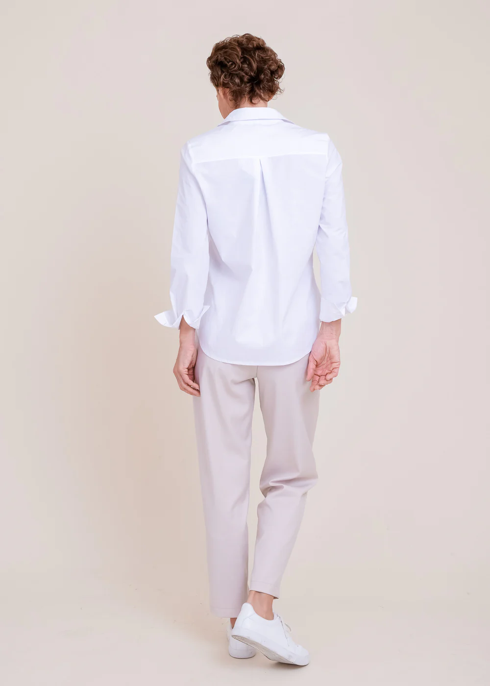 Schmaler und kürzer geschnittene Hemdbluse mit Kragen, Knopfleiste und einer Rückenpasse mit Kellerfalte. Lange Ärmel mit geknöpfter Manschette und einem abgerundeten Saum mit einem leicht verlängerten Rückenteil. Länge:60cm.