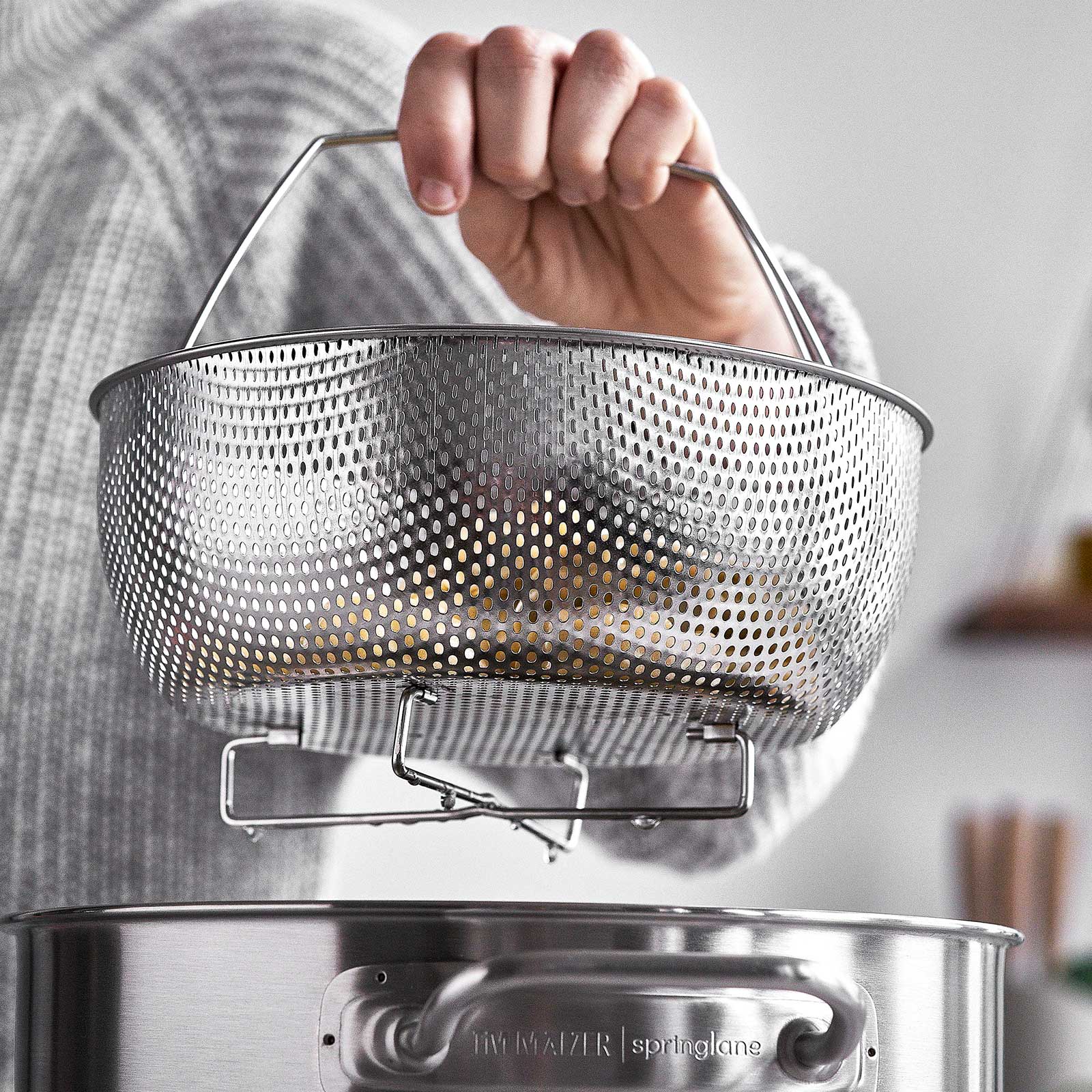 Dank der aufstellbaren Henkel und dem extra sicheren 4-Punkt-Stand kannst du den gesamten Einsatz ohne Wackeln einsetzen und nach der Zubereitung gefahrlos aus deinem Topf entnehmen.