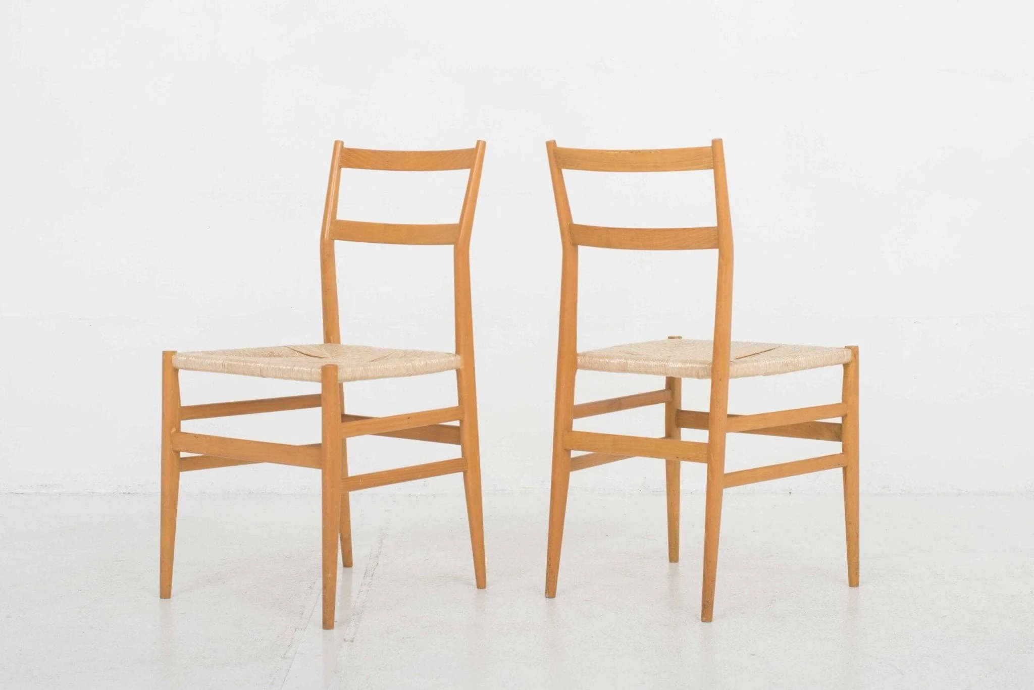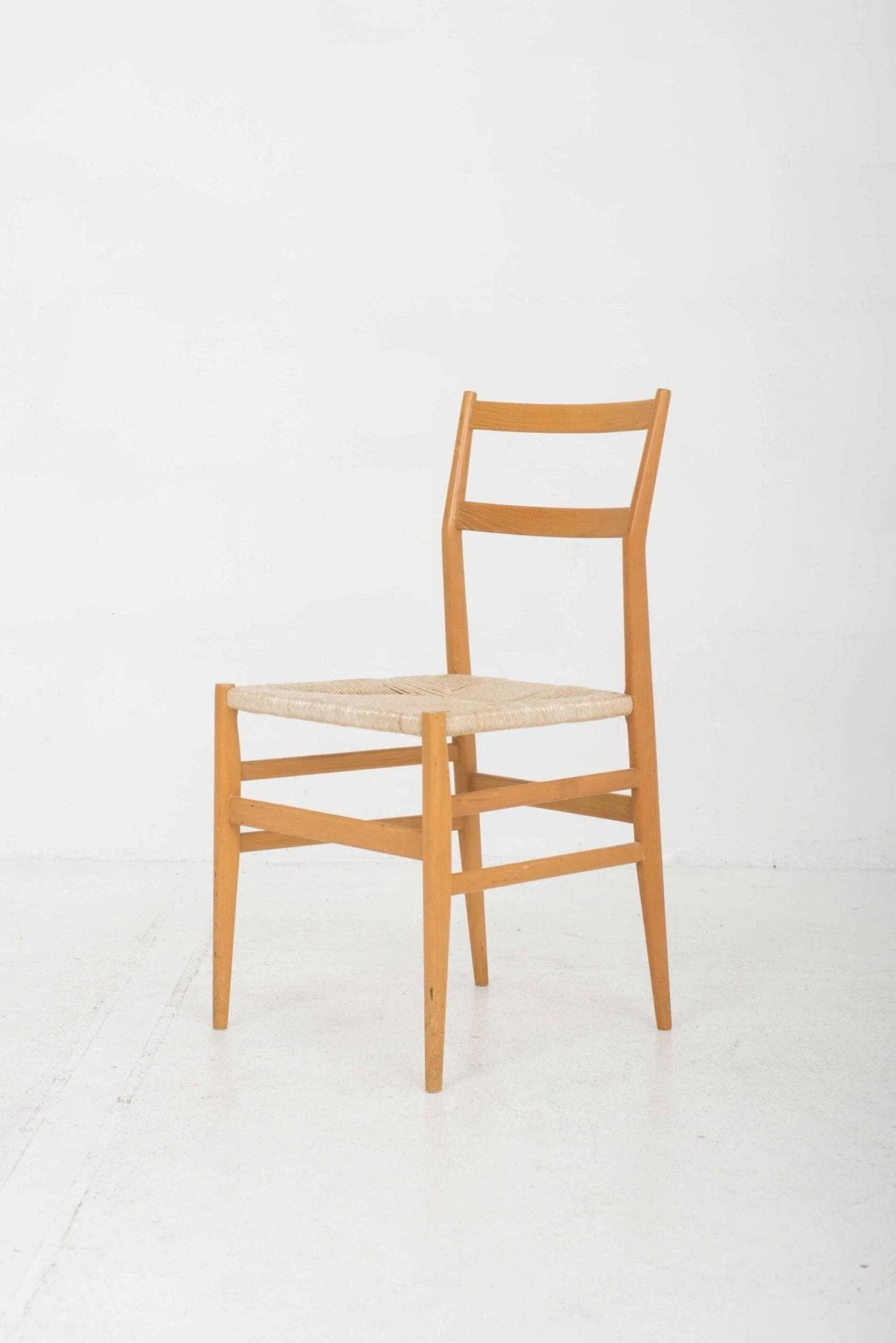 Diese sehr leichten und gleichzeitig robusten Stühle entwarf der italienische Architekt und Designer Gio Ponti im Jahr 1951/1952. Aus dem Modell mit der klaren Formensprache ging später das berühmtere Modell Superleggera hervor. Die Stühle befinden sich in einem sehr guten Zustand mit leichten Gebrauchsspuren. Preis gilt pro Stück.