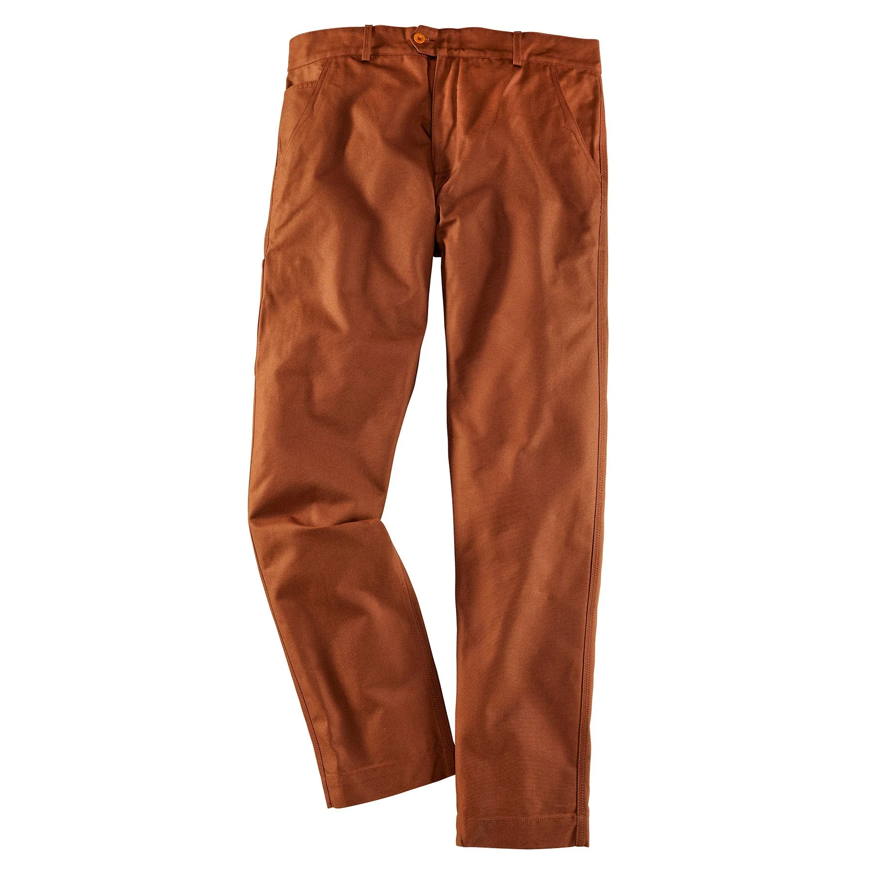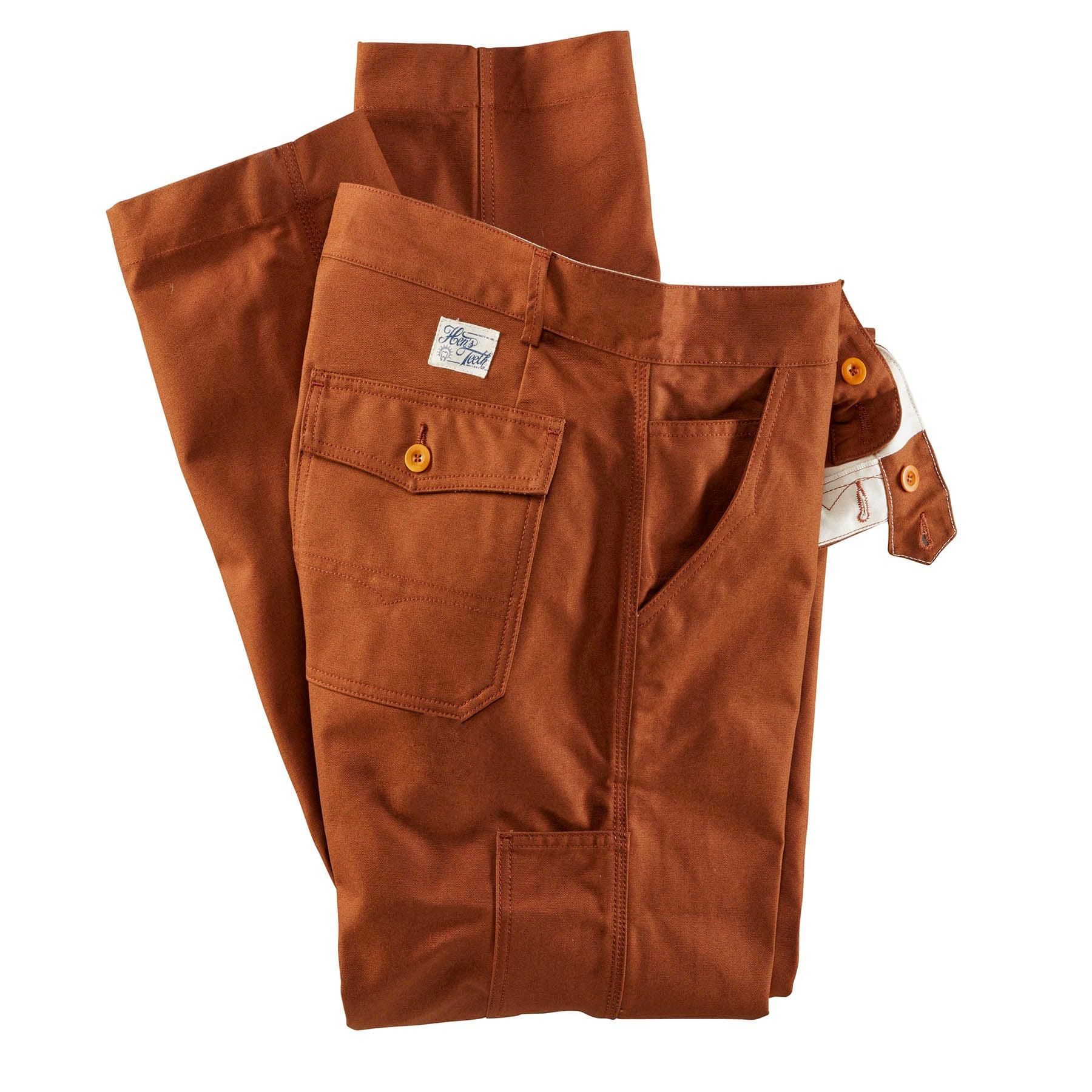 Herrenchino aus festem Canvas von Hen’s Teeth. Nicht nur der Schnitt ist den Arbeiterhosen des letzten Jahrhunderts nachempfunden, bei diesem Modell ist sogar das verwendete Material ein Original. Die italienische Weberei, die diese Baumwolle liefert, produziert immer noch dieselben Qualitäten wie 1900. Vorne mit Knopfleiste und insgesamt sechs großen Taschen wurden auch alle übrigen typischen Attribute sehr schön umgesetzt.