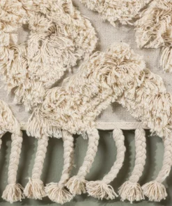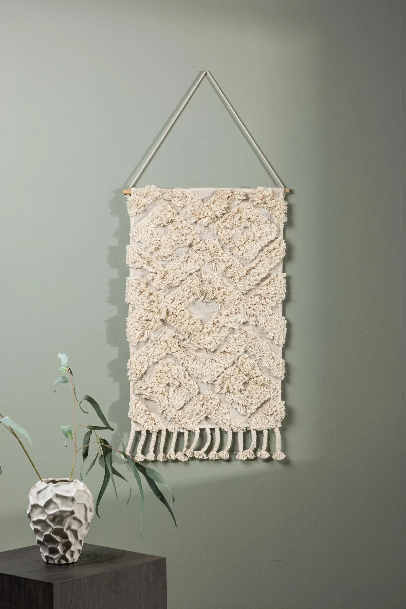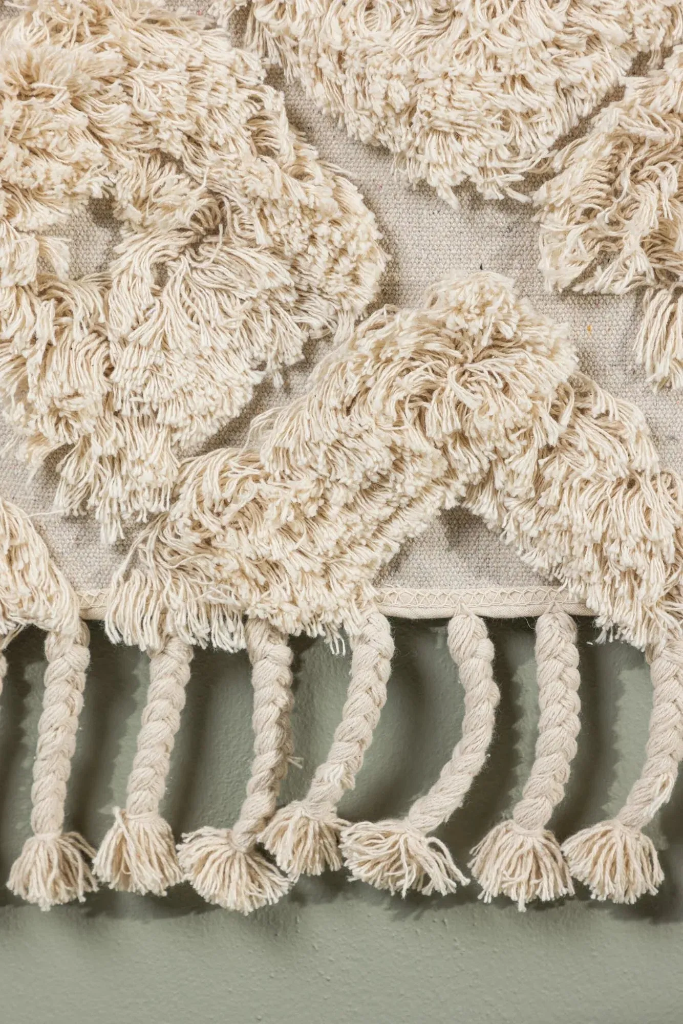 Ein weiteres Highlight sind die dekorativen geflochtenen Fransen an der Unterseite, die dem Wandteppich zusätzlichen Charme und eine verspielte Note verleihen. Diese Details machen Hilda zu einem einzigartigen Kunstwerk, das nicht nur funktional ist, sondern auch als künstlerisches Element fungiert.