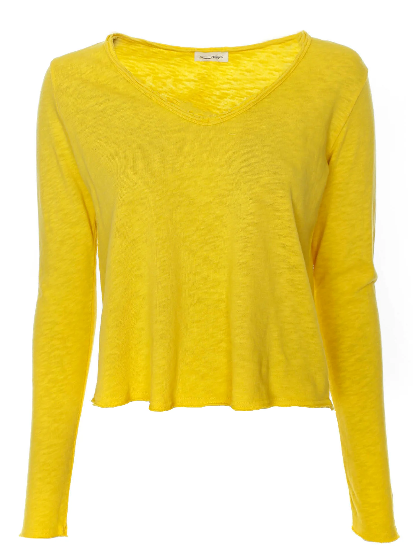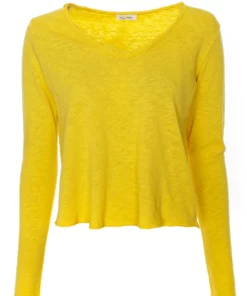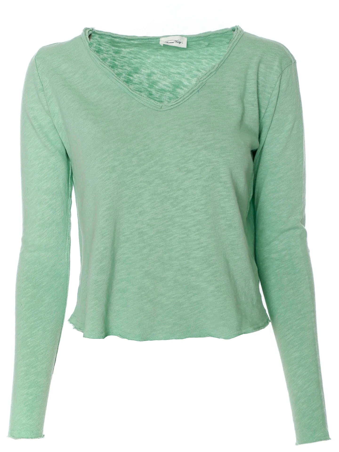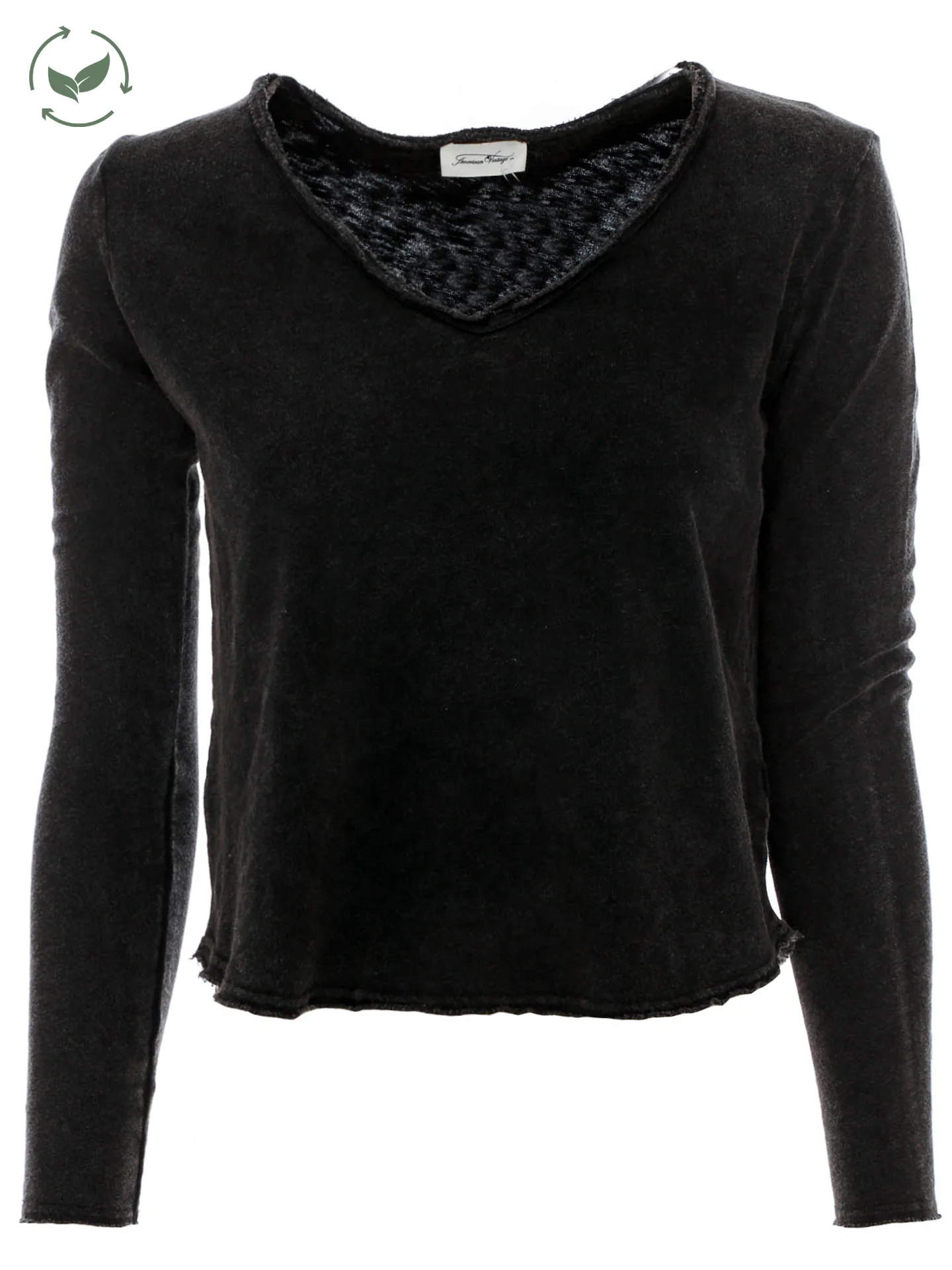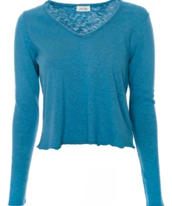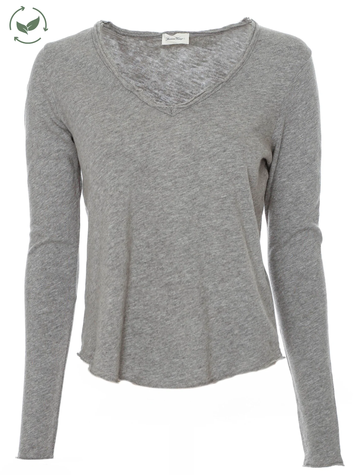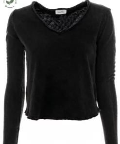 Longsleeve mit V-Ausschnitt*Rollsaum mit offenen Saumkanten*Leicht angeraute Oberfläche auf der Innenseite*Leicht melierte Optik*Softe Haptik*Abgerundeter Saum*Gerader Schnitt sowie lockere Passform*Länge: etwa hüftlang*Made in Portugal