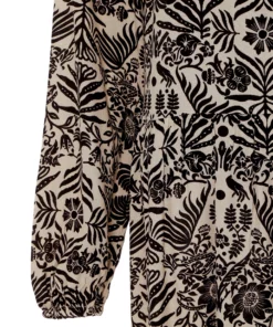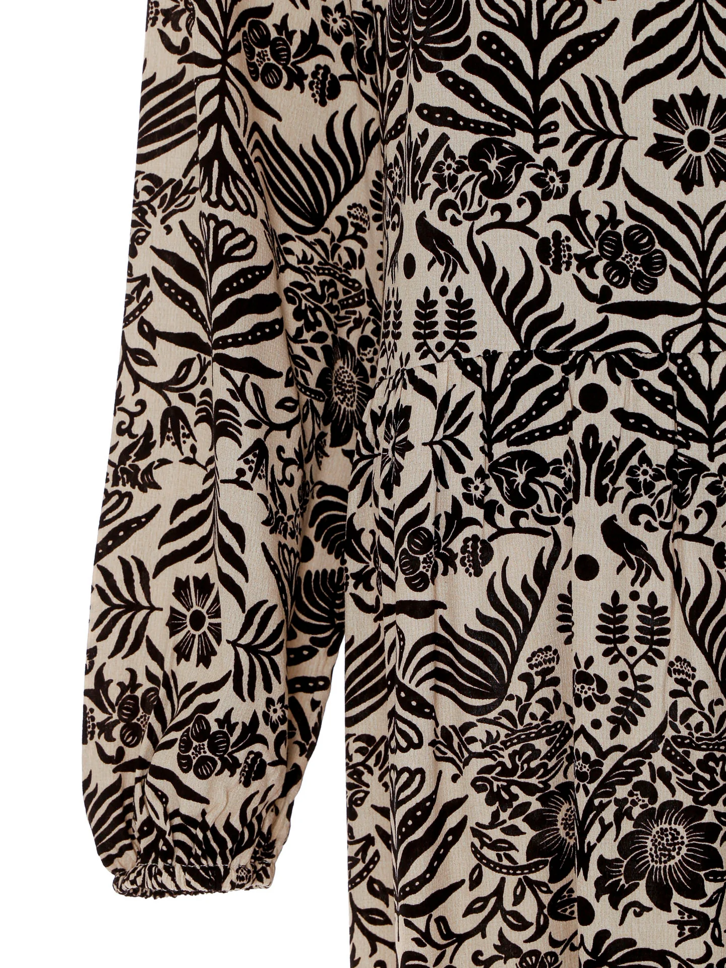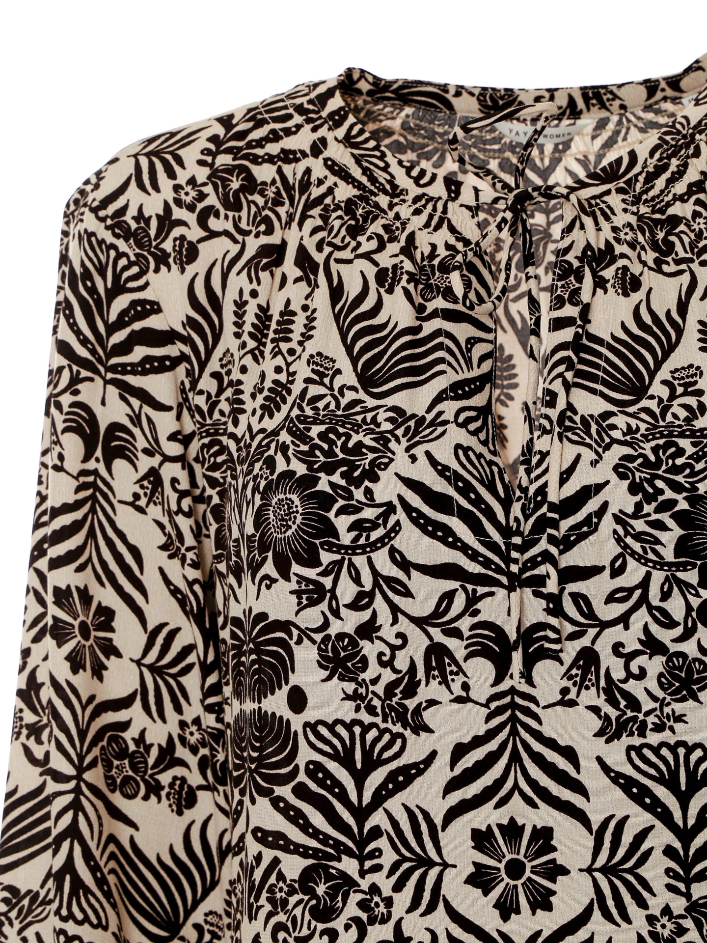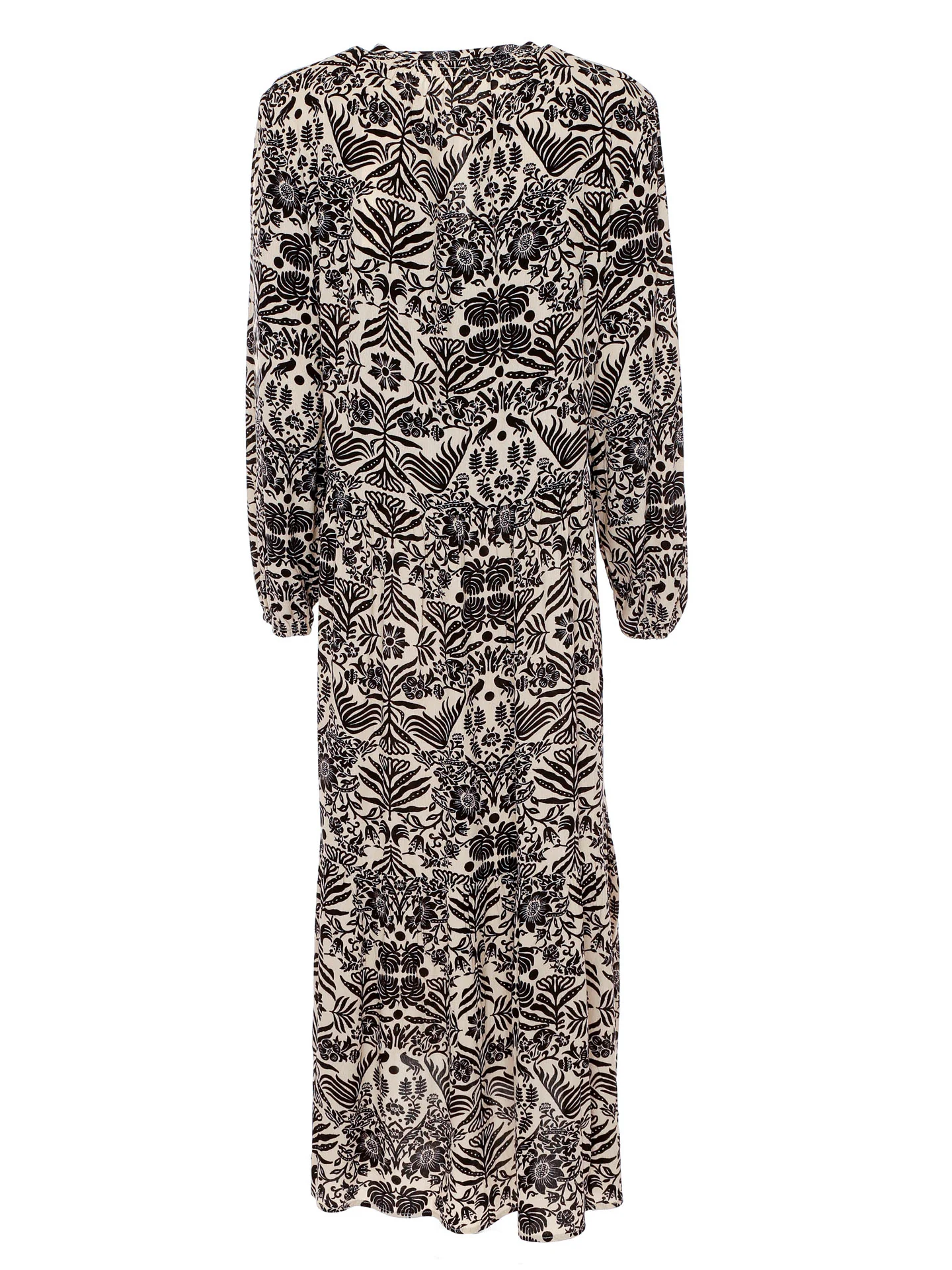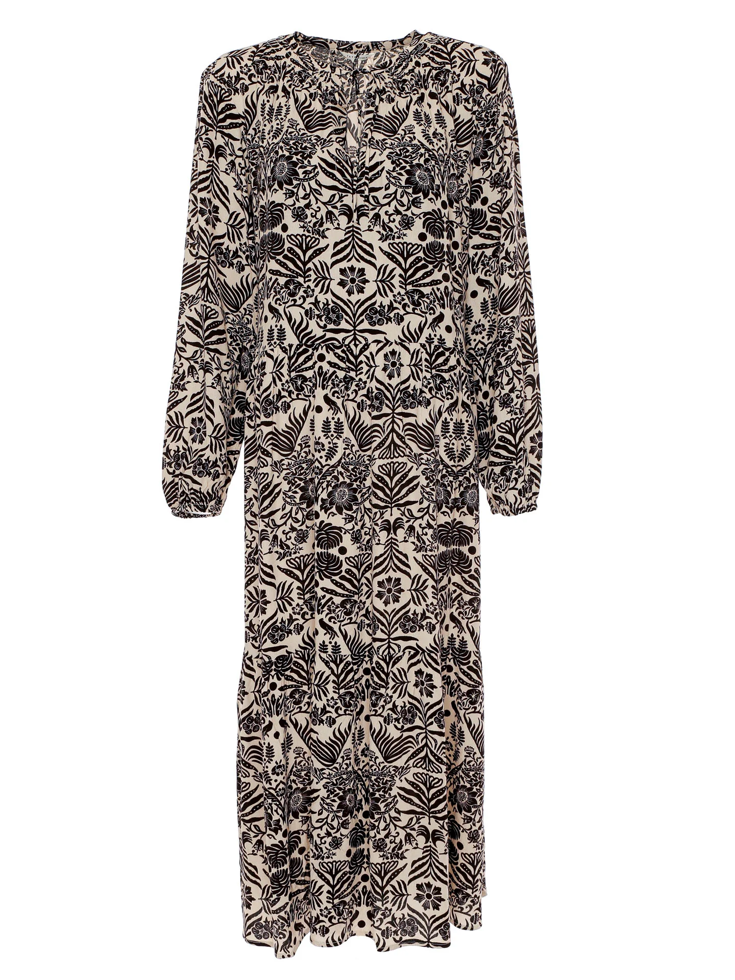 Langes weites Kleid mit Folklore-Print*V-Ausschnitt mit Band zum Binden*Elastischer dünner Gummibund an den Ärmelabschlüssen*Länge: etwa knöchellang