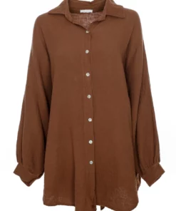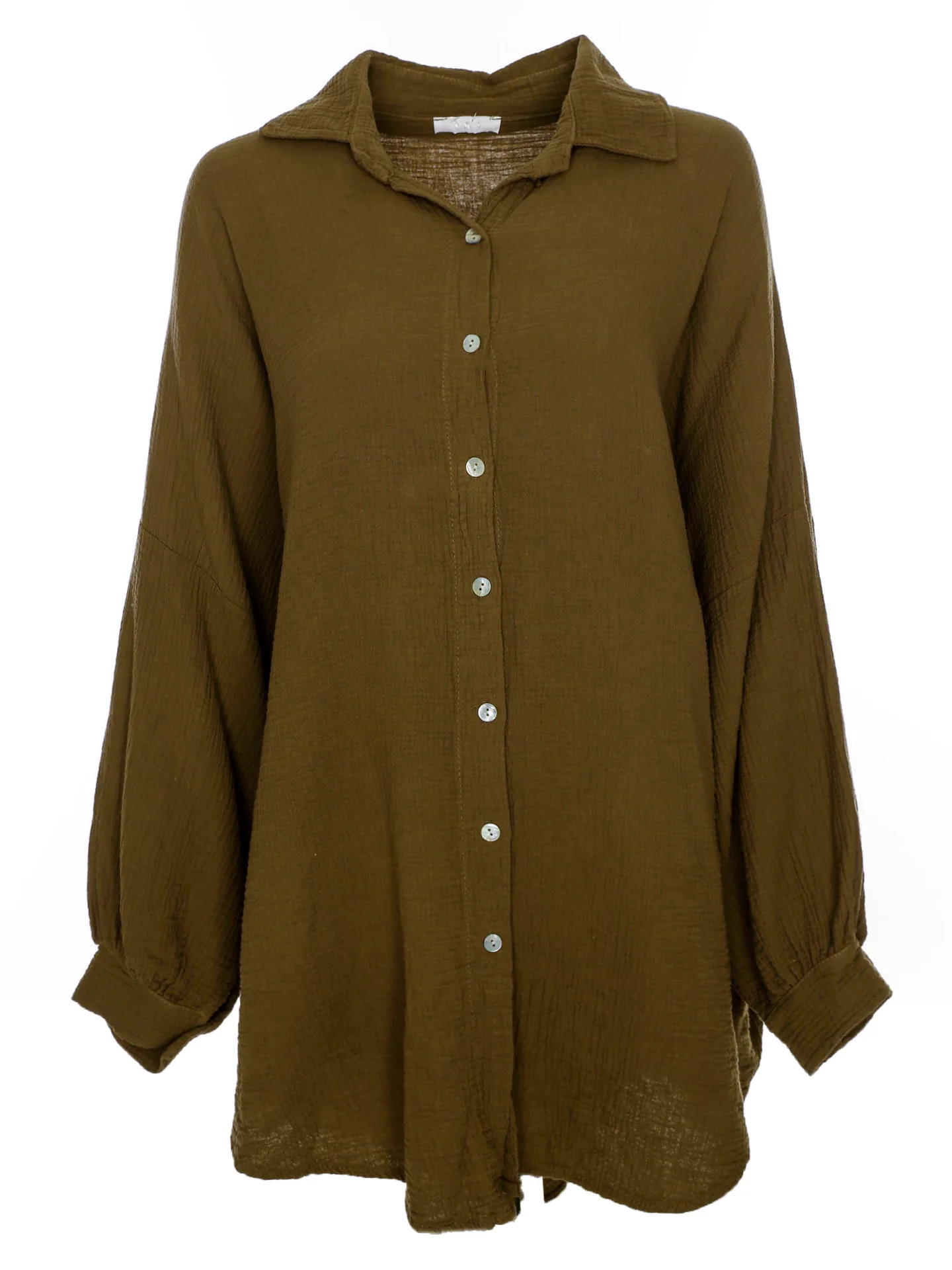 Weite Musselin Hemdbluse mit klassischem Kragen,Durchgehende Knopfleiste mit Perlmuttfarbenen Knöpfen,Überschnittene Schultern,Fledermausärmel mit 1-Knopf-Manschetten als Abschlüsse,Abgerundete Saumkanten,Verlängerte Rückenpartie,Oversized-Fit,Lockere Passform,Farbton: dunkles oliv mit leicht bräunlichem Unterton,Länge: Knielang