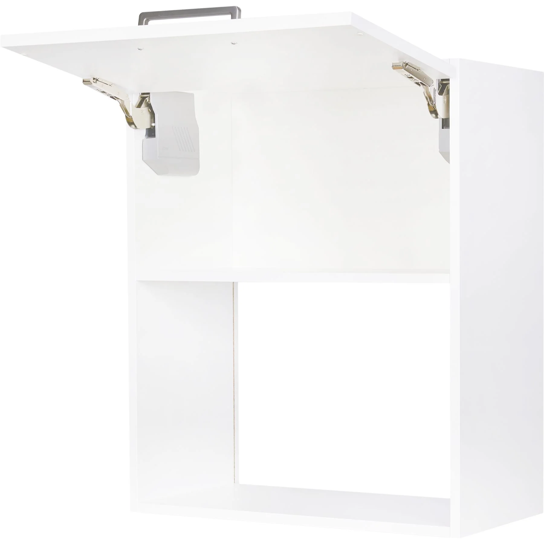 Der weiße Oberschrank Korpus wird mit einer hochwertigen Klappen-Front im Dekor Touch 332 Alpinweiß supermatt ergänzt. Der Wandschrank ist mit einem hochwertigen Blum Aventos Hochklappen-Beschlag bestückt, der mit seiner SoftClose funktion BLUMOTION sanft und leise schließt.