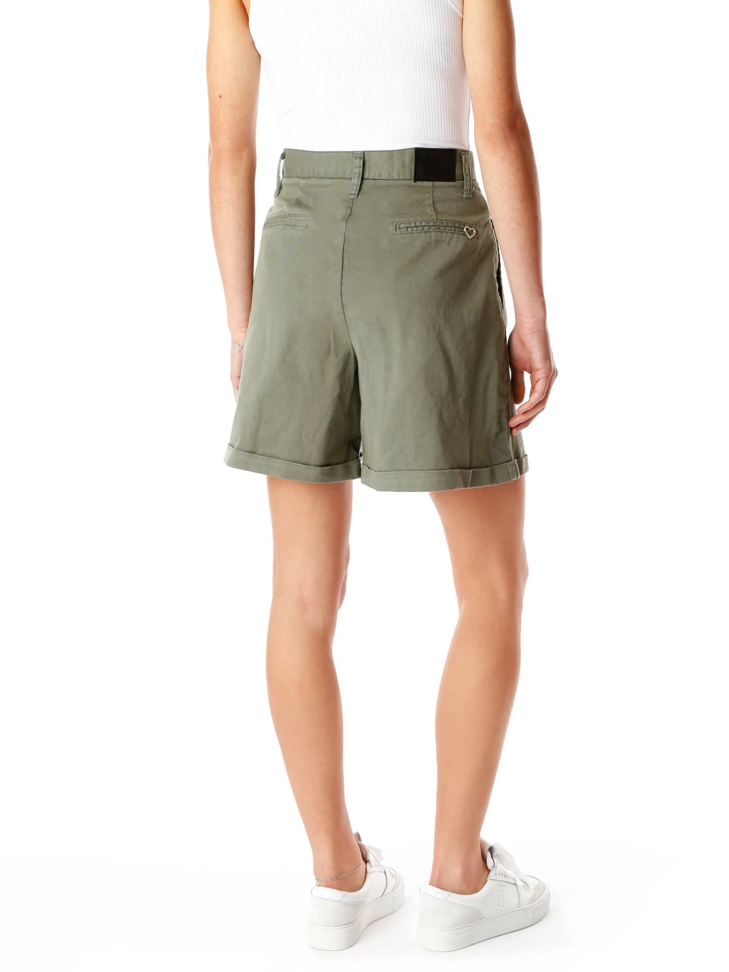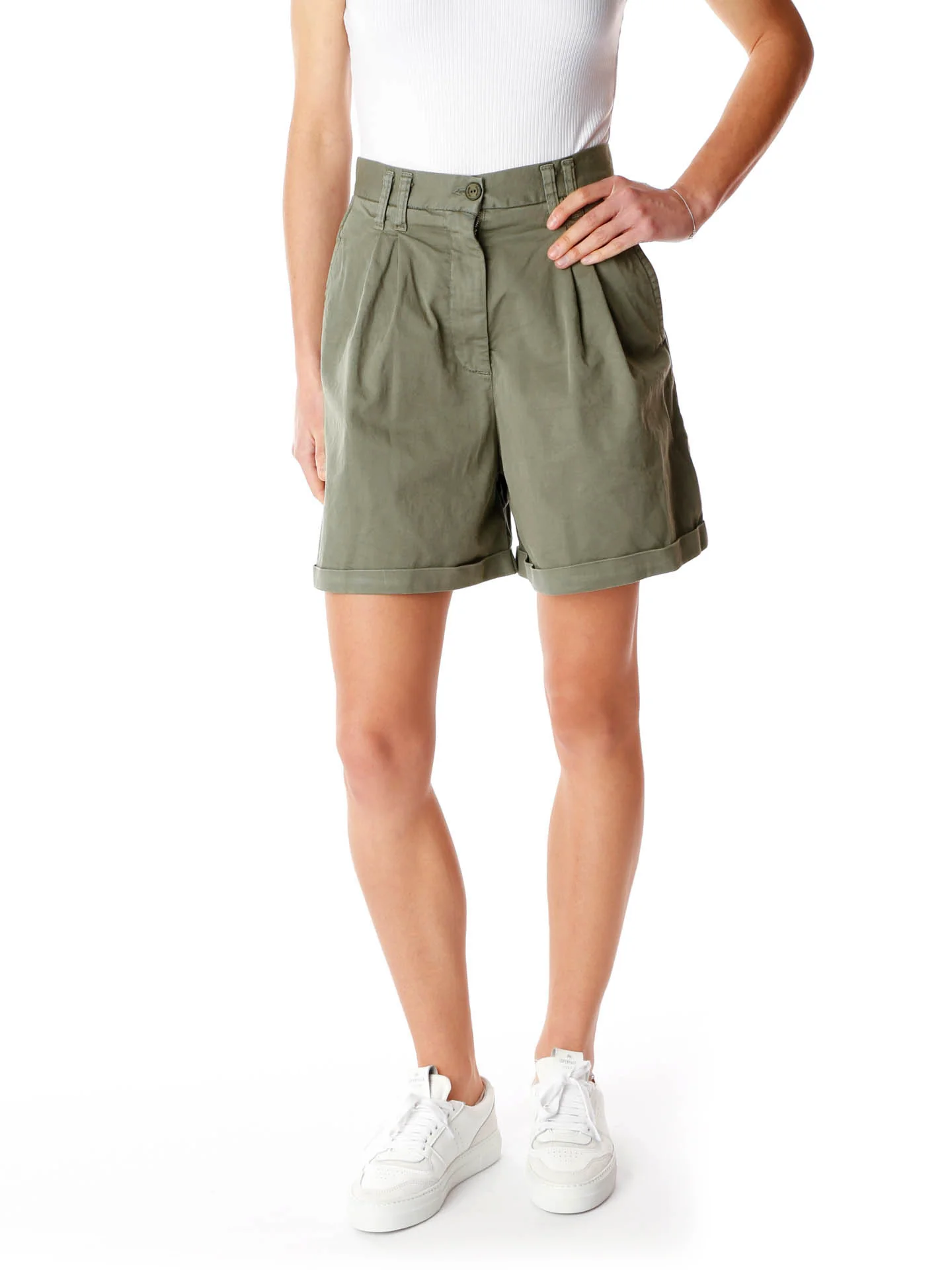Bundfalten-Shorts mit hoher Leibhöhe*Mit Knopf und Reißverschluss zu verschließen*Eingrifftaschen an den Seiten*Angedeutete Leistentaschen auf der Rückseite*Fixierter Umschlang am Beinabschluss*Lässige Passform*Länge: Mitte des Oberschenkels