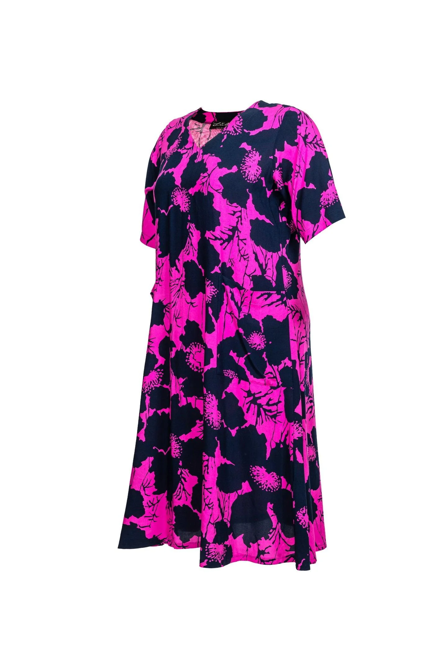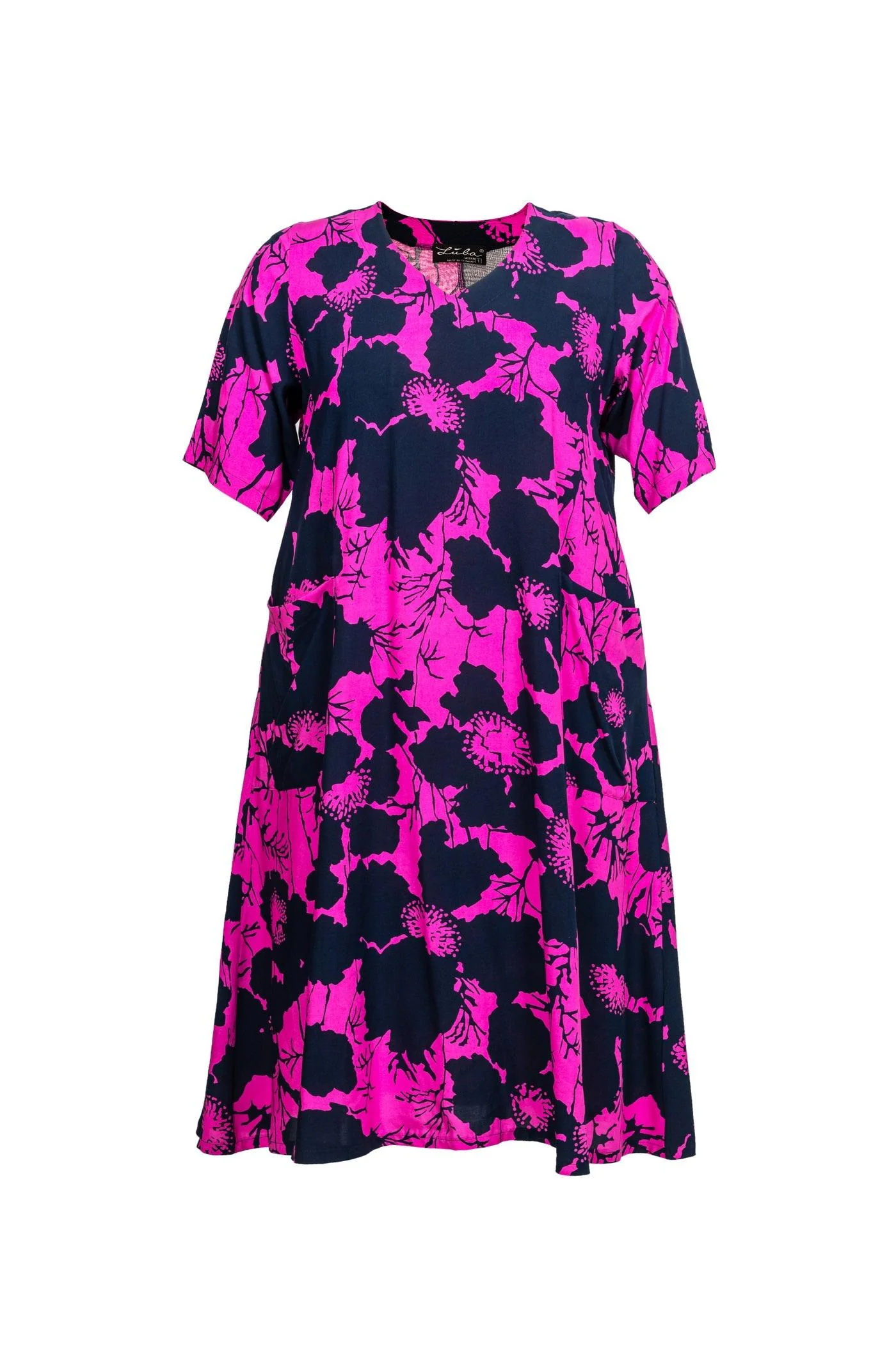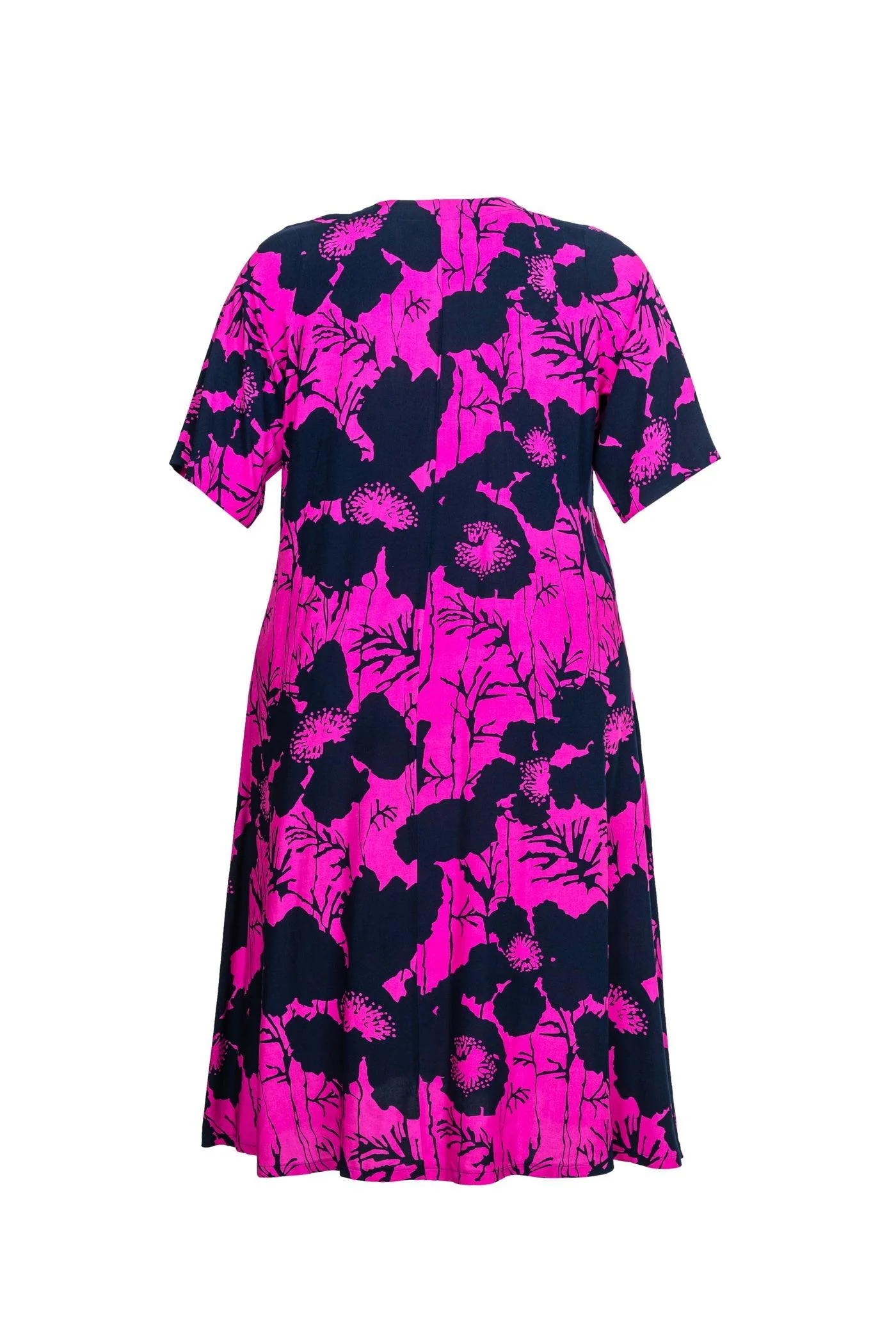 Bringen Sie frischen Wind in Ihre Garderobe mit unserem pink-blauen Viskose-Kleid, das sowohl stilvoll als auch komfortabel ist. Der weiche Viskose-Stoff liegt angenehm auf der Haut und bietet exzellenten Tragekomfort. Die A-Linie mit einem eleganten V-Ausschnitt und kurzen Ärmeln sorgt für eine schmeichelhafte Silhouette, während der lebendige Flower-Print mit blauen Blüten dem Kleid eine frische, feminine Note verleiht. Zwei praktische Taschen bieten zusätzlichen Komfort. Dieses Kleid ist ideal für verschiedene Anlässe und lässt sich vielseitig kombinieren.