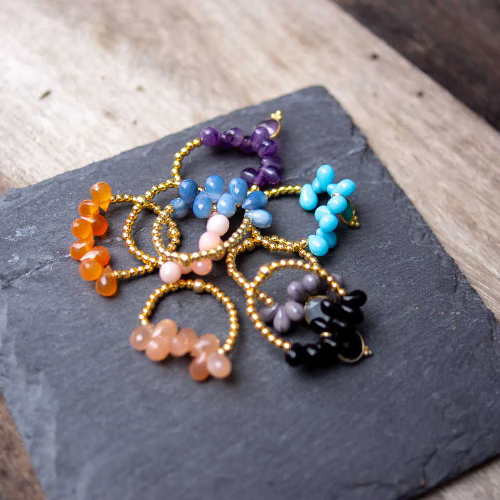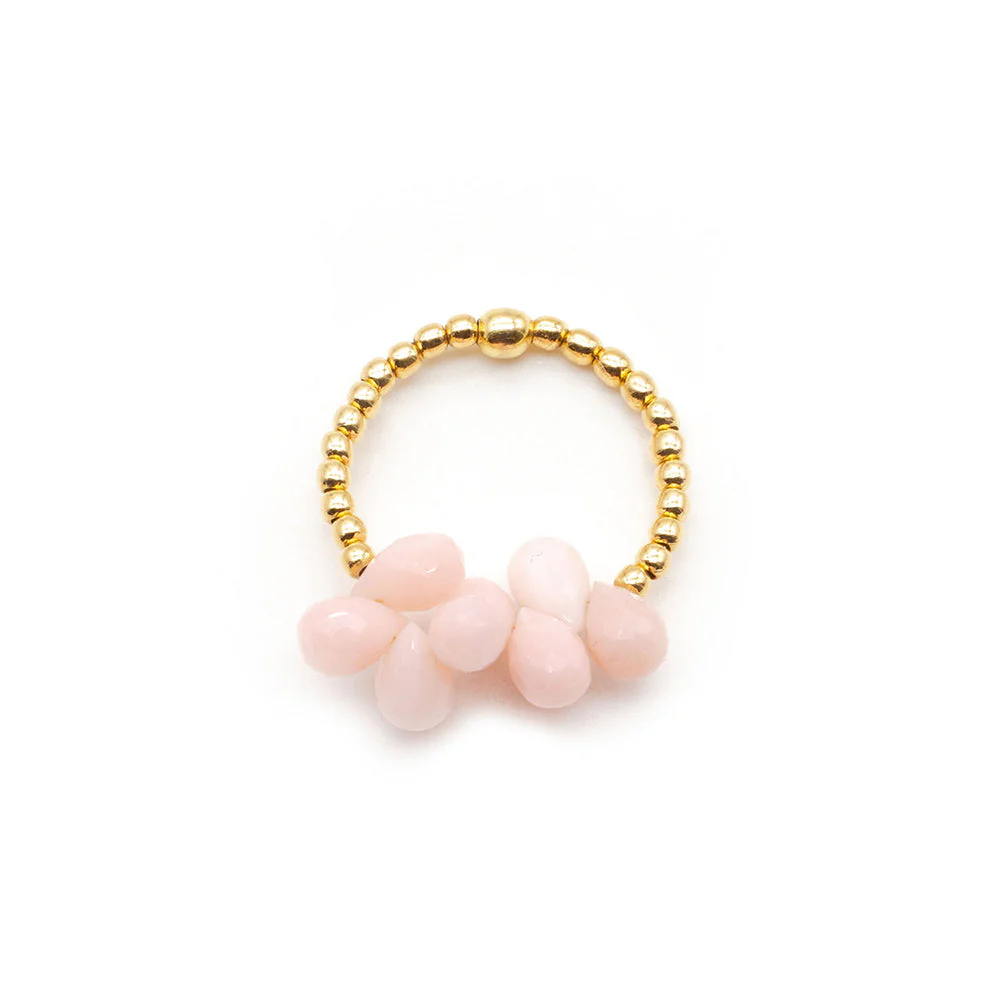 Schöner Ring mit elsatischem Band von Schmückstück, verziert mit Edelsteintropfen aus Opal und Chalcedon-Anhängern. Opalen wird nachgesagt, die Kommunikation zu fördern und den Ausdruck von Emotionen zu erleichtern. Zudem kann der Opal die Fantasie und Kreativität anregen sowie dazu beitragen, im Umgang mit anderen einfühlsamer und verständnisvoller zu sein. Der Chalcedon hingegen verhilft zu mehr Selbstvertrauen, innerer Ruhe, Aufmerksamkeit und Durchsetzungsvermögen. Bei diesem Ring handelt es sich um einen Ring mit Elastband. Die Standardgröße dieser Ringe passt perfekt auf Finger mit einer Ringgröße zwischen 54 und 58.