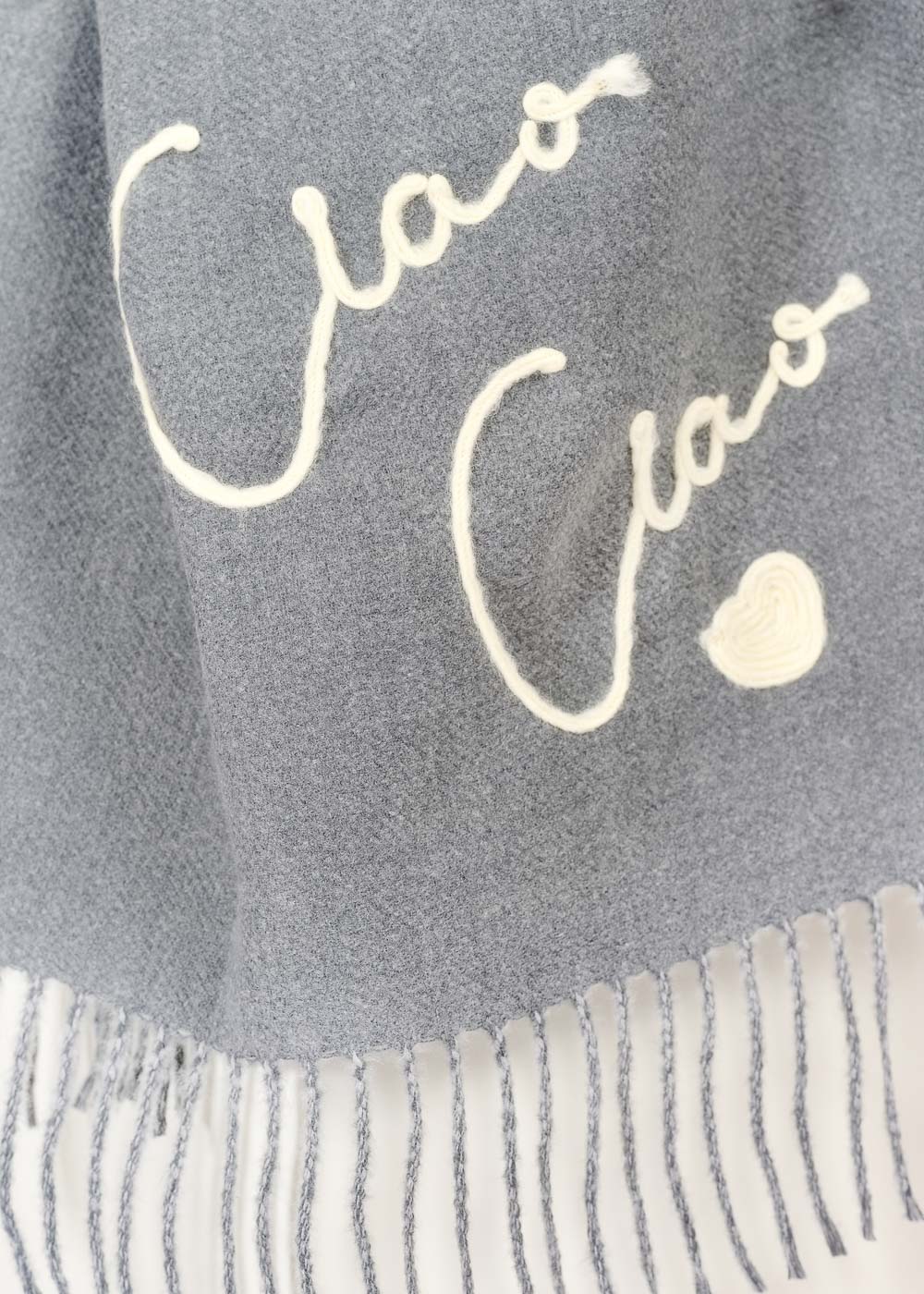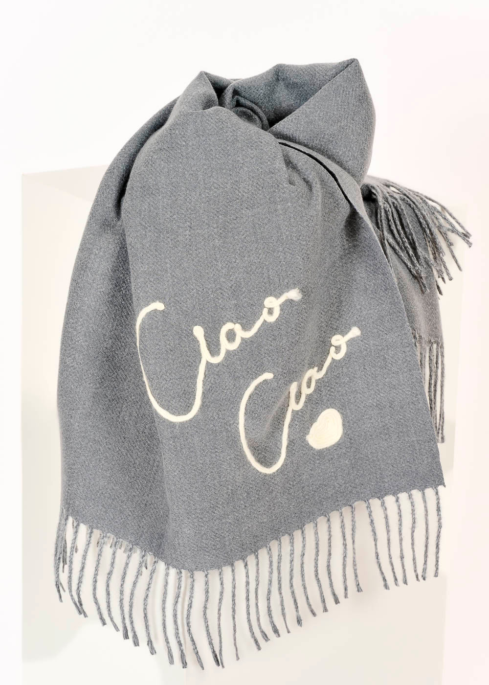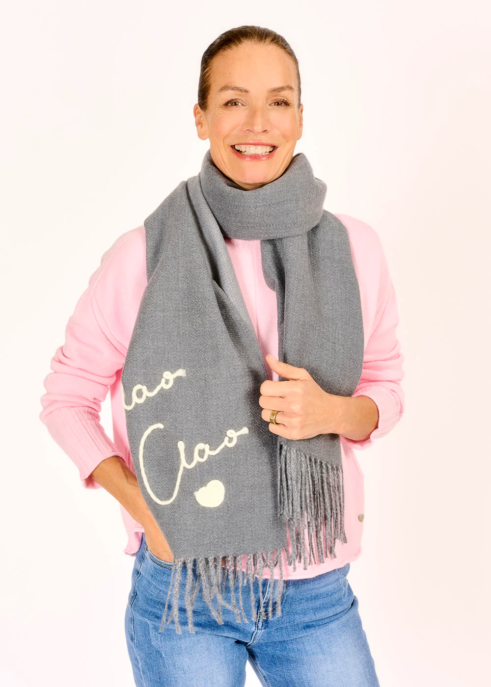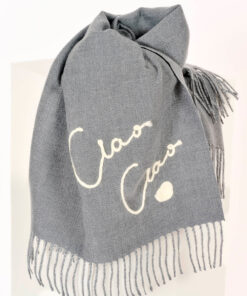 Entdecke den stilvollen Sciarpa in Grau – weich, elegant und mit liebevoll gestickten “Ciao Ciao”. Perfekt, um deinem Look einen Hauch italienischer Leichtigkeit zu verleihen!