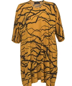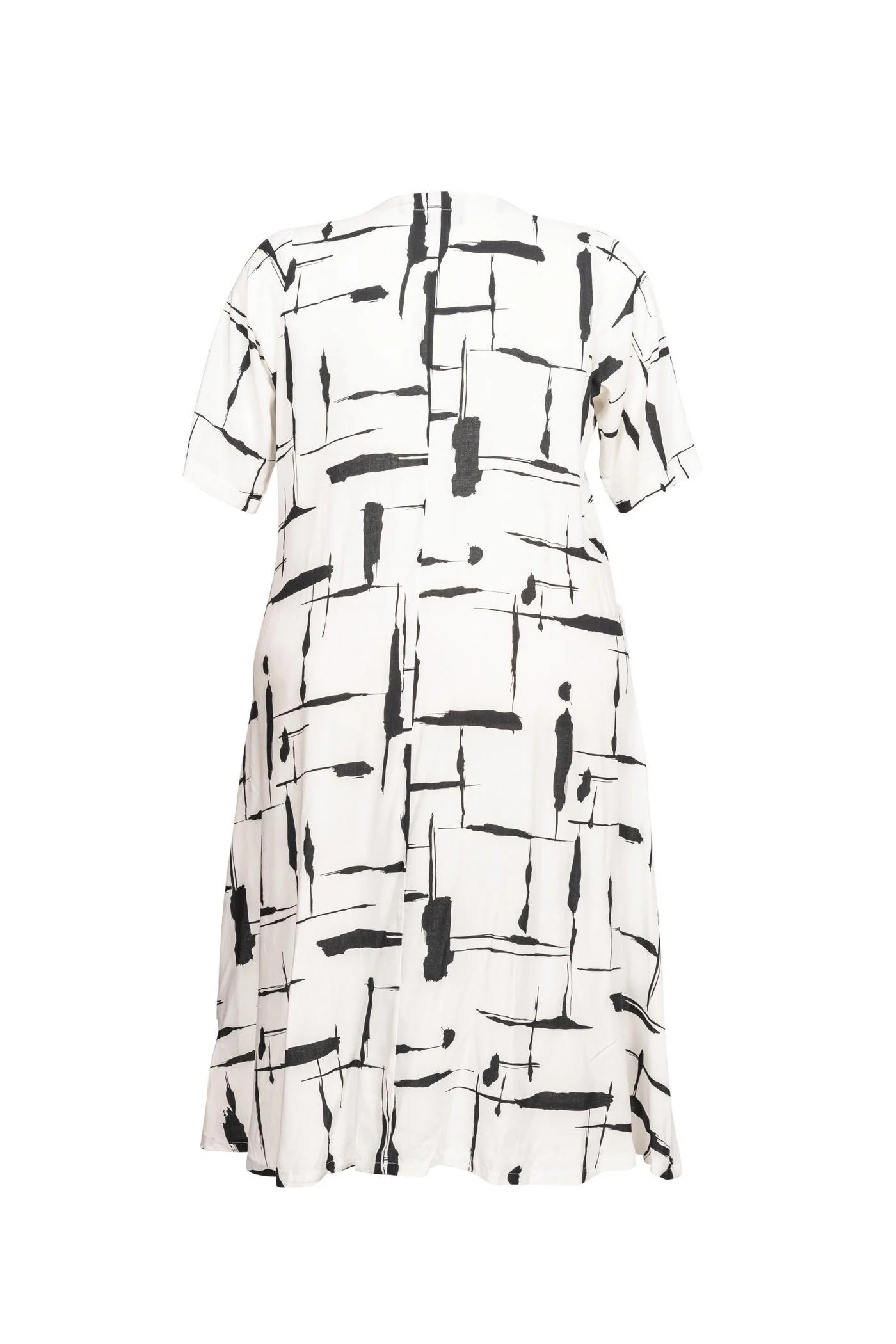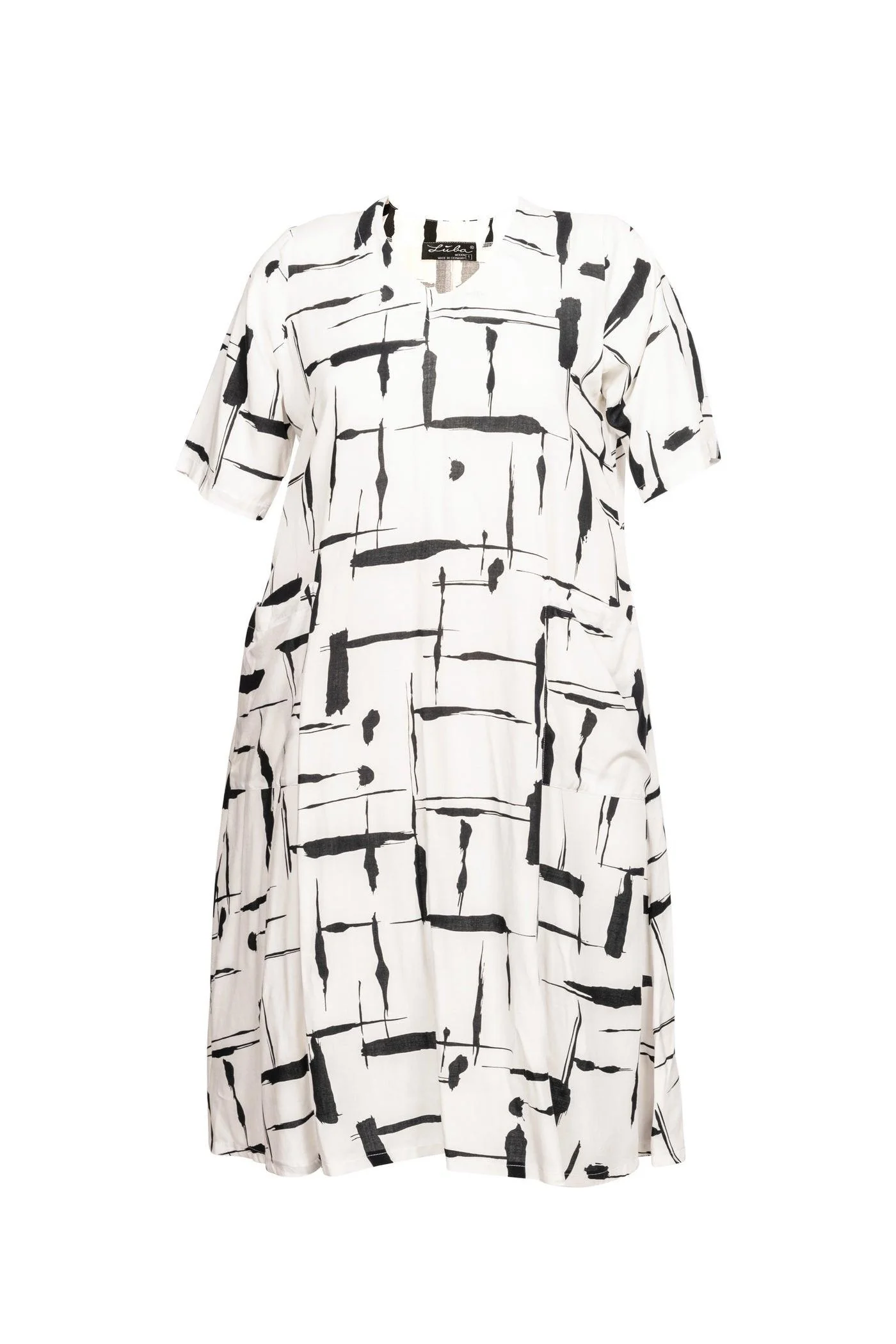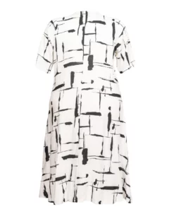 Verleihen Sie Ihrer Garderobe eine moderne Note mit unserem weiß-schwarzen Viskose-Kleid. Der fließende Viskose-Stoff sorgt für ein angenehmes Tragegefühl, während der A-Linien-Schnitt mit V-Ausschnitt und kurzen Ärmeln eine feminine Silhouette zaubert. Das Kleid ist mit einem auffälligen Allover-Print in schwarzen Mustern verziert, der ihm eine elegante und gleichzeitig lebendige Optik verleiht. Zwei praktische Taschen ergänzen das Design und bieten zusätzlichen Komfort. Perfekt für verschiedene Anlässe, bietet dieses Kleid unzählige Styling-Möglichkeiten.