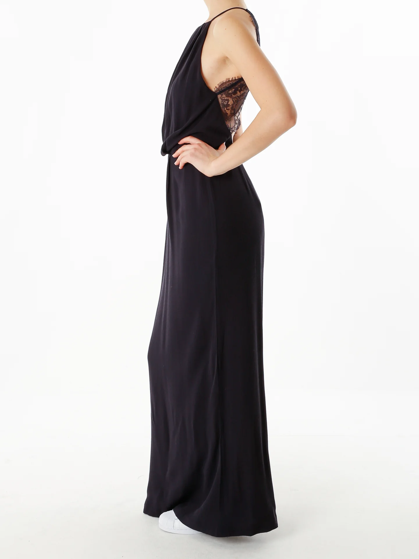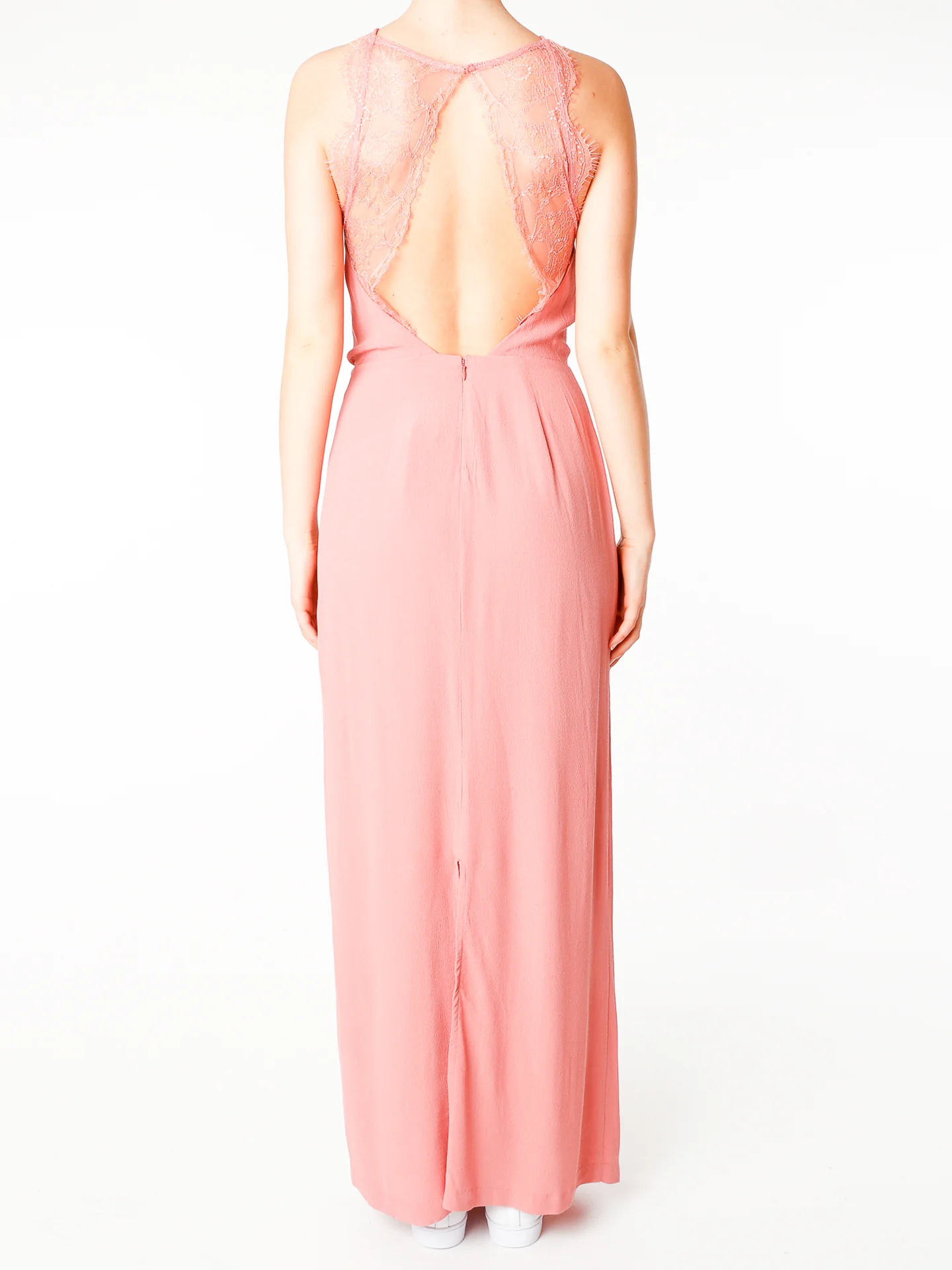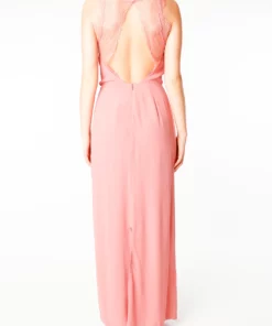 Hochgeschlossenes Kleid mit weiten Armausschnitten,Tiefer Rückenausschnitt mit Spitzte,Taillenbund,Geschlitzter Saum,Bei einer Größe von 1.75 m trägt unser Model Gr.S