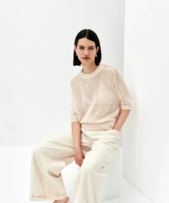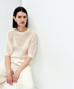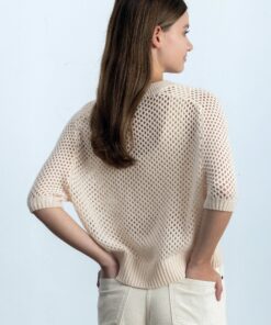 Schlagwörter: 30% Cashmere, 70% Wolle, Creme, damen, Grobstrick, Halbarm, Kastiger Schnitt, Pullover, Rundhals, Spring/Summer 2025